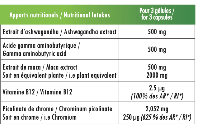 - • Ashwagandha : plante adaptogène régulant les hormones (dont le cortisol) et favorisant le bien-être intellectuel et physique.