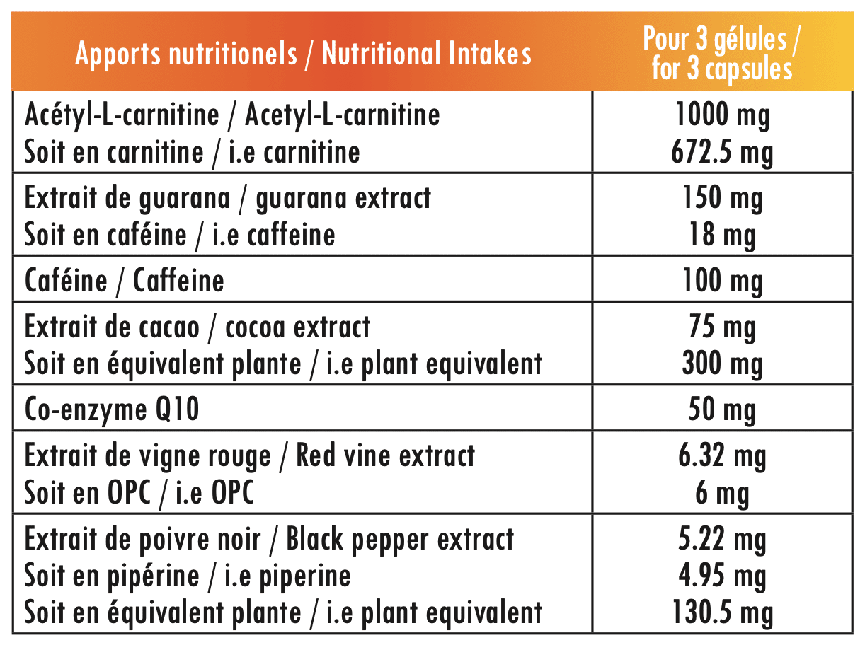 - • Acétyl-L-carnitine : transporte les acides gras pour les transformer en énergie utilisable par les muscles.